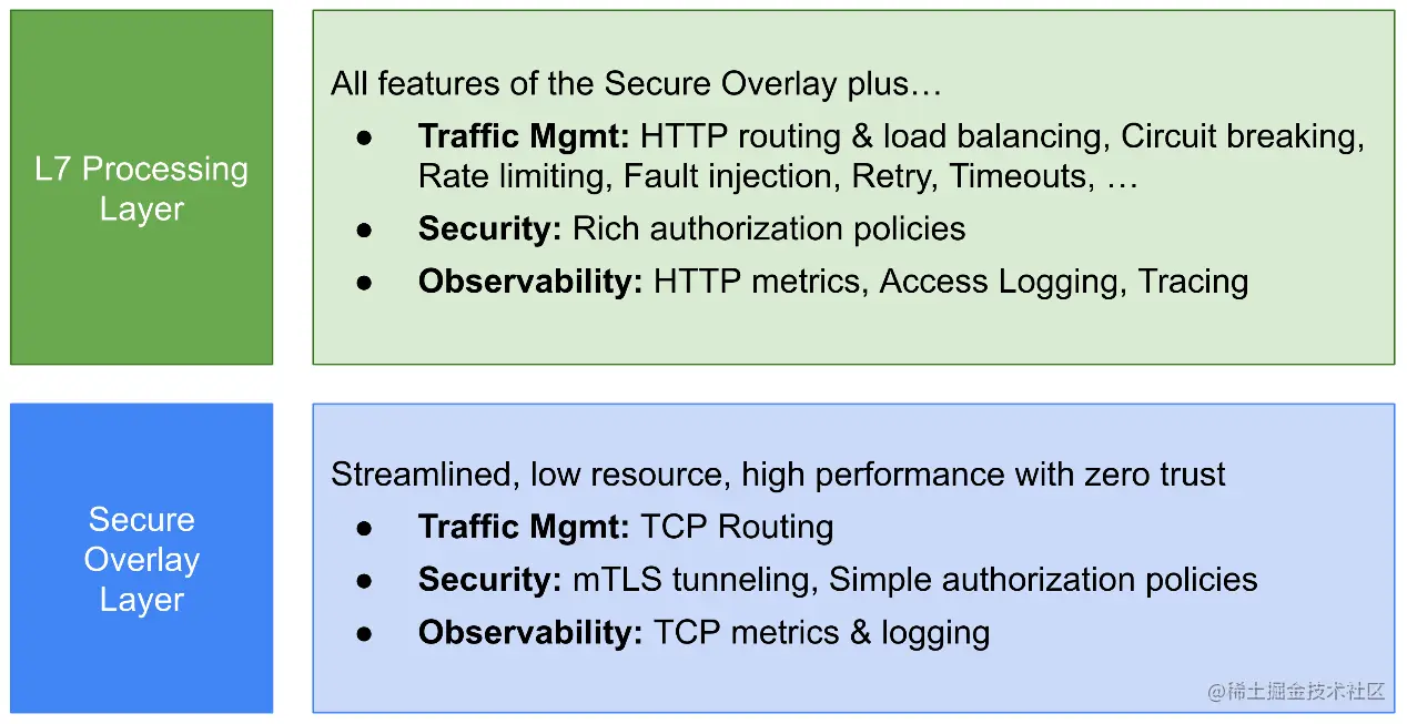 **• 安全覆盖层:**处理TCP路由、监控指标、访问日志,mTLS 隧道,简单的授权