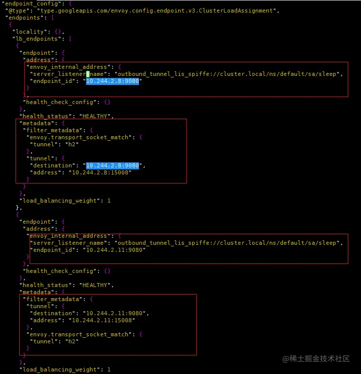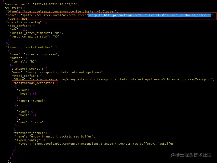 (3) "spiffe://cluster.local/ns/default/sa/sleep_to_http_productpage.default.svc.cluster.local_outbound_internal"过滤器关联到同名的Cluster。该Cluster一共包含两个Endpoint实例,根据负载均衡算法选择某一个Endpoint,并且最重要的是将metadata(tunnel的destination和address)传递给名为"outbound_tunnel_lis_spiffe://cluster.local/ns/default/sa/bookinfo-productpage" 的监听器处理。
