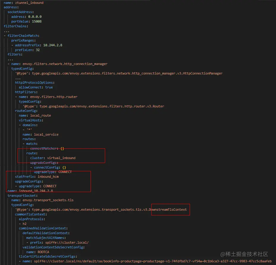 (2) ztunnel上面“ztunnel_inbound”监听器监听在15008端口,因此流量首先经过ztunnel_inbound监听器的处理。ztunnel_inbound监听器上面设置了TLS,根据其配置与下游进行TLS握手,从而所有的ztunnel之间基于双向TLS加密通信。另外,从下面配置中可以看到,CONNECT 升级已经设置,那么Envoy就会代理HTTP的Connect请求。除此之外,RouteMatch中设置了connectMatcher,意味着将HTTP Connect请求交由“virtual_inbound”Cluster处理。