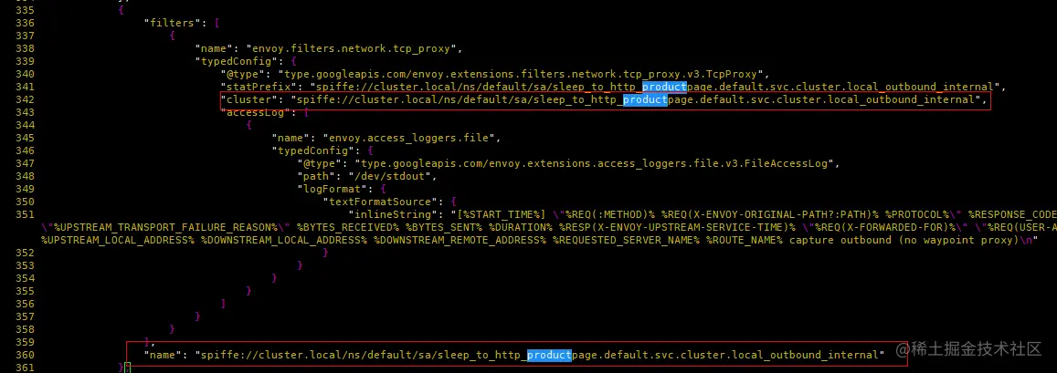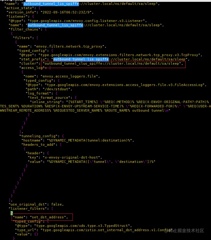(4) “outbound_tunnel_lis_spiffe://cluster.local/ns/default/sa/sleep”监听器通过“set_dst_address”过滤器根据上一步的选择的Endpoint的metadata设置数据的目的地址。假如前面outbound_internal Cluster选择的是10.244.2.8:9080这个Endpoint,那么这里的tunnel监听器将把10.244.2.8:15008设置为目的地址。另外该监听器,只有一个TcpProxy,关联到名为“outbound_tunnel_clus_spiffe://cluster.local/ns/default/sa/ sleep”的Cluster,那么流量自然交由该Cluster处理。TCP过滤器上还设置了HTTP Connect隧道(承载发送到10.244.2.8:9080的流量),供后面productpage所在节点的ztunnel使用。HTTP隧道是Ambient Mesh 组件之间安全通信的承载协议。