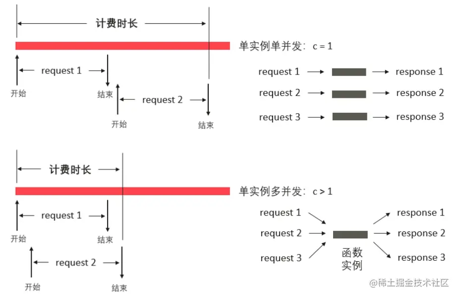 从公式(2)的函数成本结构中可以看出,在用户业务模型支持的前提下,**配置一定的单实例并发度 ,可以有效降低函数月度总成本;**若用户不进行配置,云平台默认值通常为 1,即单个实例同一时刻只能处理一个请求;因此,在函数被并发调用的情形下,平台会启动多个实例进行响应,从而增大了计费实例数目,如图 6 所示;同时,采用单实例多并发,也能改善调用请求处于等待状态的尾时延。