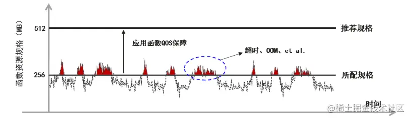最后讨论函数资源规格的选择问题。从公式(2)明显可以看出,更大规格的实例内存 对应更高的计费成本。但内存规格的选择,需要同时考虑对函数执行时延 的影响。从用户函数的角度看,函数执行时延除了由代码本身的业务逻辑决定之外,还受实例运行时可使用资源大小的影响。**更大的实例规格,对应更大的可使用内存和更多的 CPU 份额,从而可能显著改善高内存占用型或 CPU 密集型函数的执行性能,**降低执行时延;当然,**这种改善也存在上限,**超过某个资源规格后,资源的增加对降低函数执行时延的效果几乎可以忽略,如图 7 中虚线所表示的过程。上述事实表明,对于给定的用户函数,为降低总计费成本,需要配置合理的实例规格