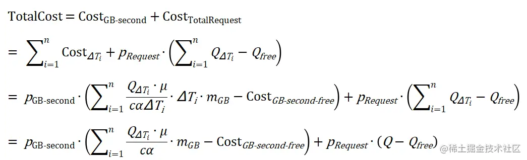 可以认为在用户配置之后属于常数;α属于平台侧参数,也可视作常数;**对于函数执行时延μ,实际中通常会由于冷热启动差异、网络抖动、调用请求入参等的不同而波动,且考虑到 Serverless 计费是精确到毫秒级别的,因此严格意义上不能被视作为常数。**不过,作为估计模型,这里暂且假定μ也为常数,综上,总成本模型可以表示为: