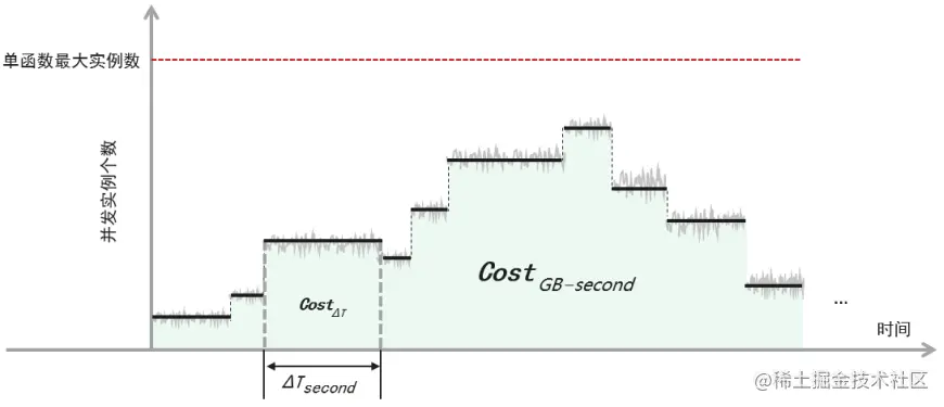 单实例视角下的函数计费估计模型,可参考[2]。在真实生产环境中,除异步函数外,Serverless 云平台通常采用 FCFS(First Come First Serve)的方式响应调用请求,对于函数流量的潮汐波动,平台通过自动扩缩容实例进行自适应,系统中运行的并发实例数随时间的变化,可以由一个分段常线性函数完全刻画,如图 2 所示。