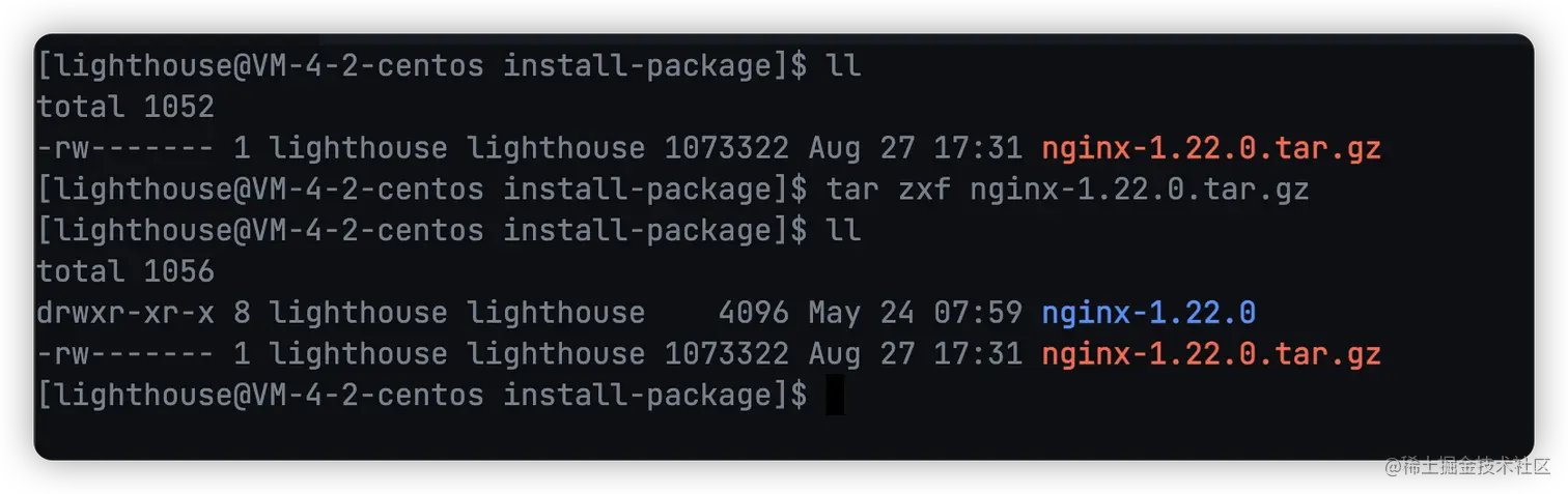 将下载后的 Nginx 压缩包进行解压,解压命令如下。