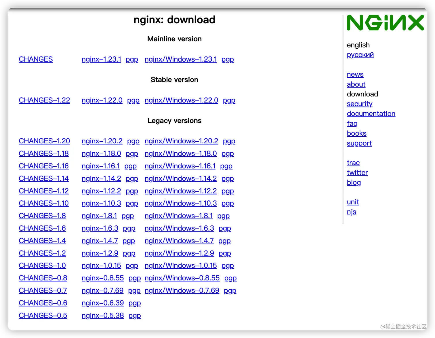 前往 Nginx 官方地址下载对应的版本,因为这里主要是在服务器中安装,所以是以 Linux(Centos) 版本来演示。