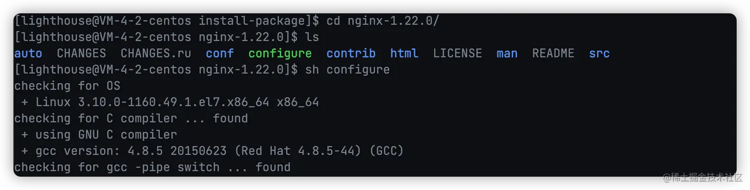 Nginx 所在文件夹,然后执行 configure 脚本,这时候就会检查安装 Nginx 所需的依赖,这里可能会因为你的服务器中没有事先安装所需依赖而导致报错。