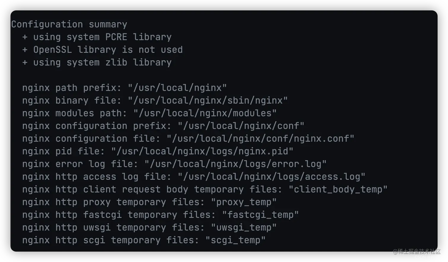 如果顺利执行完 configure 脚本,则会在服务器终端打印出以上 Nginx 相关的配置。