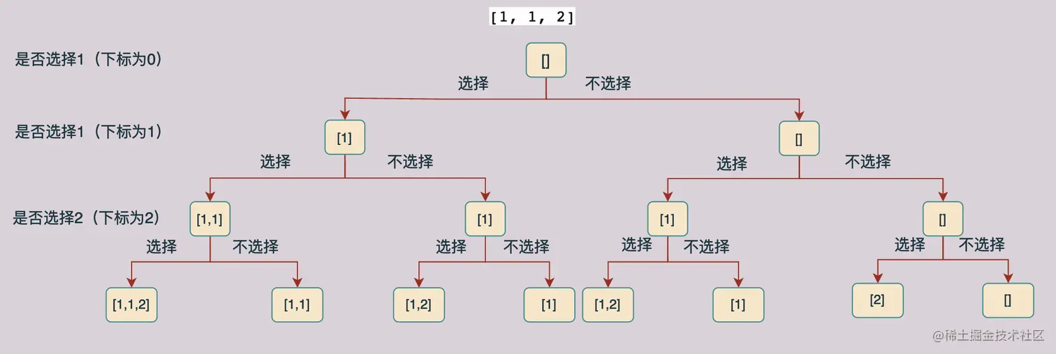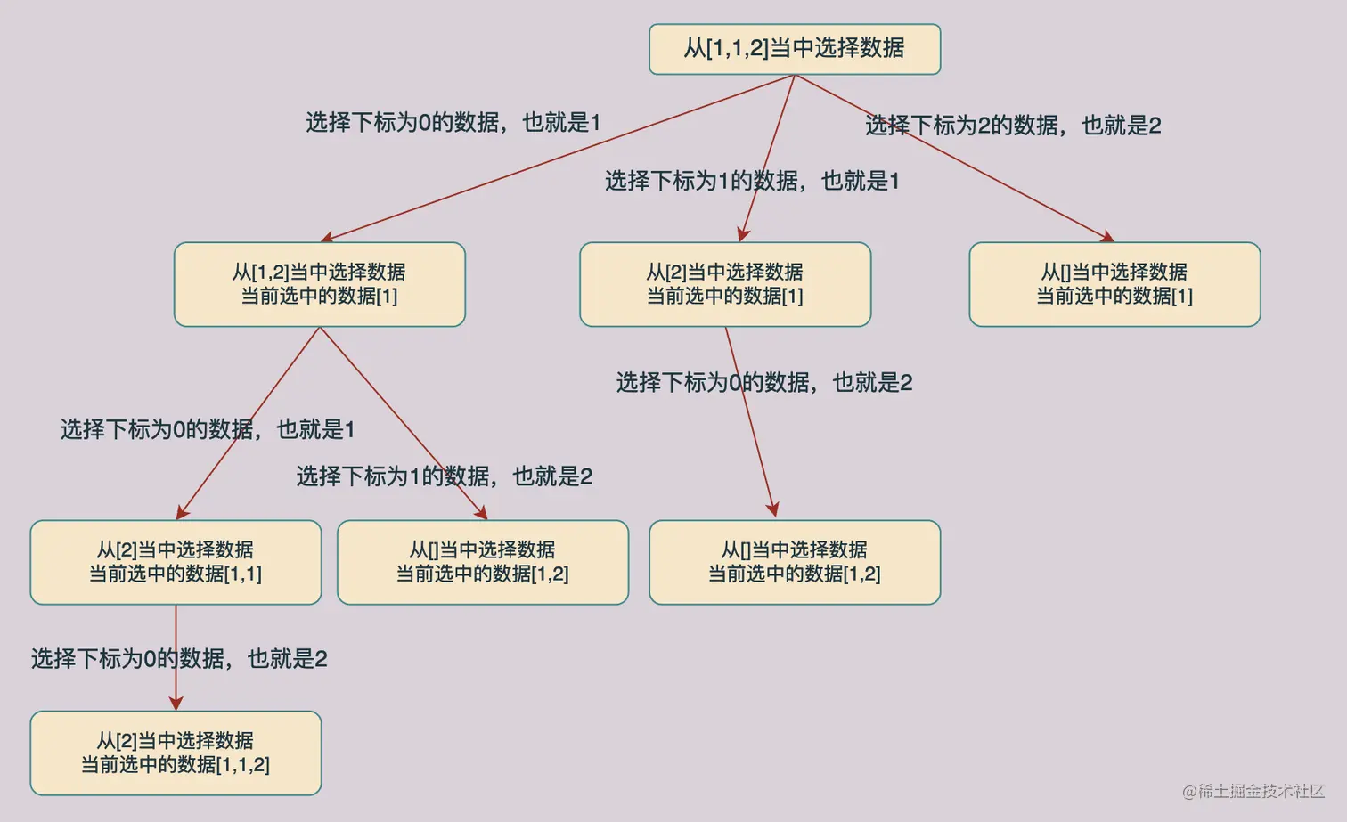 在这个问题当中为了避免产生重复的集合,我们可以首先将这些数据进行排序,然后进行遍历,我们拿一个数据来进行举例子:[1, 2 1],现在我们将这个数据进行排序得到的结果为:[1, 1, 2],那么遍历的树结构如下: