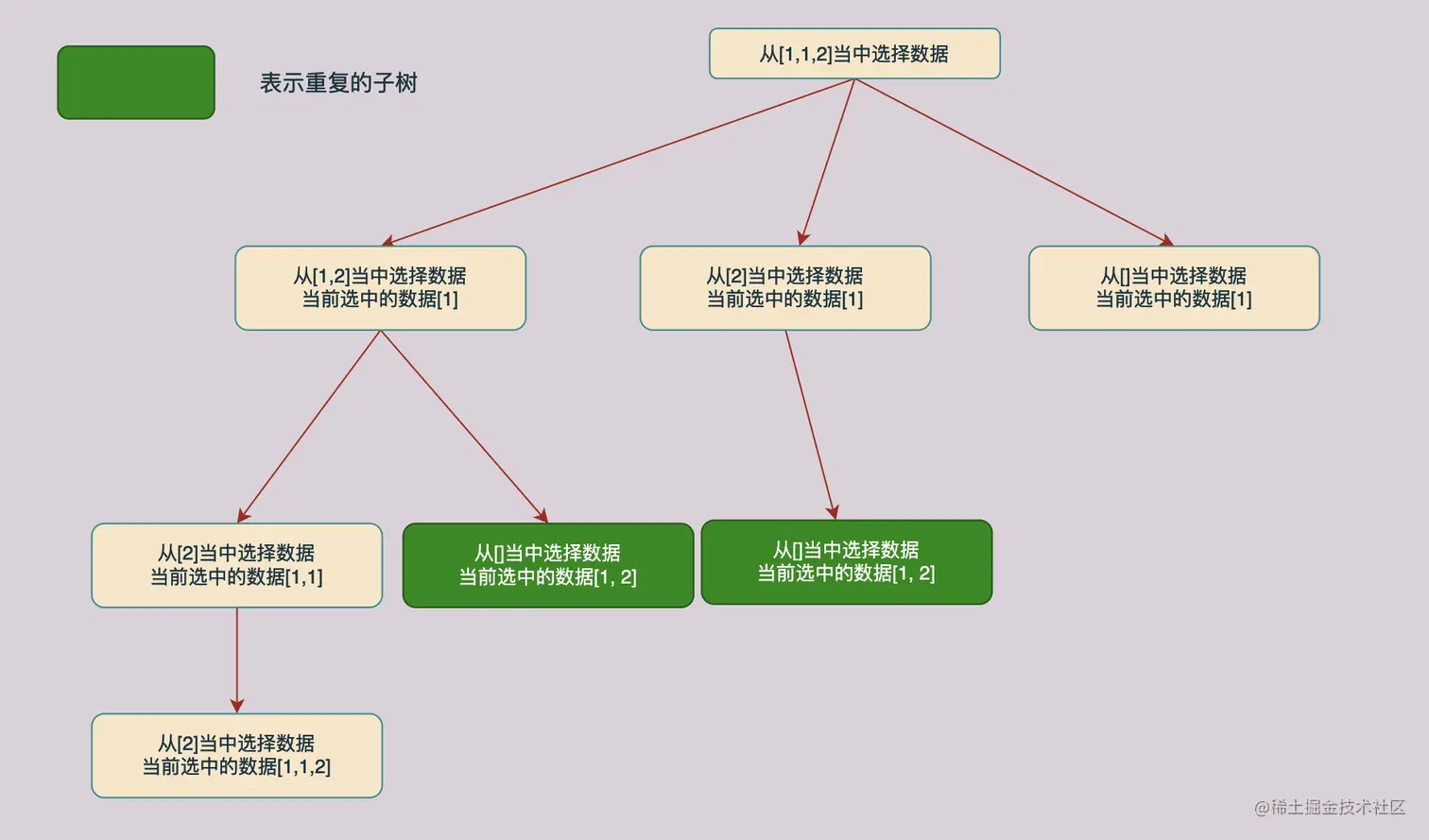 上图表示[1, 1, 2]的遍历树,每一个数据都有选和不选两种情况,根据这种分析方式可以构造上面的解树,我们对上面的树进行分析我们可以知道,在上面的树当中有一部分子树是有重复的(重复的子树那么我们就回产生重复的结果,因此我们要删除重复的分支,也就是不进行递归求解),如下图所示: