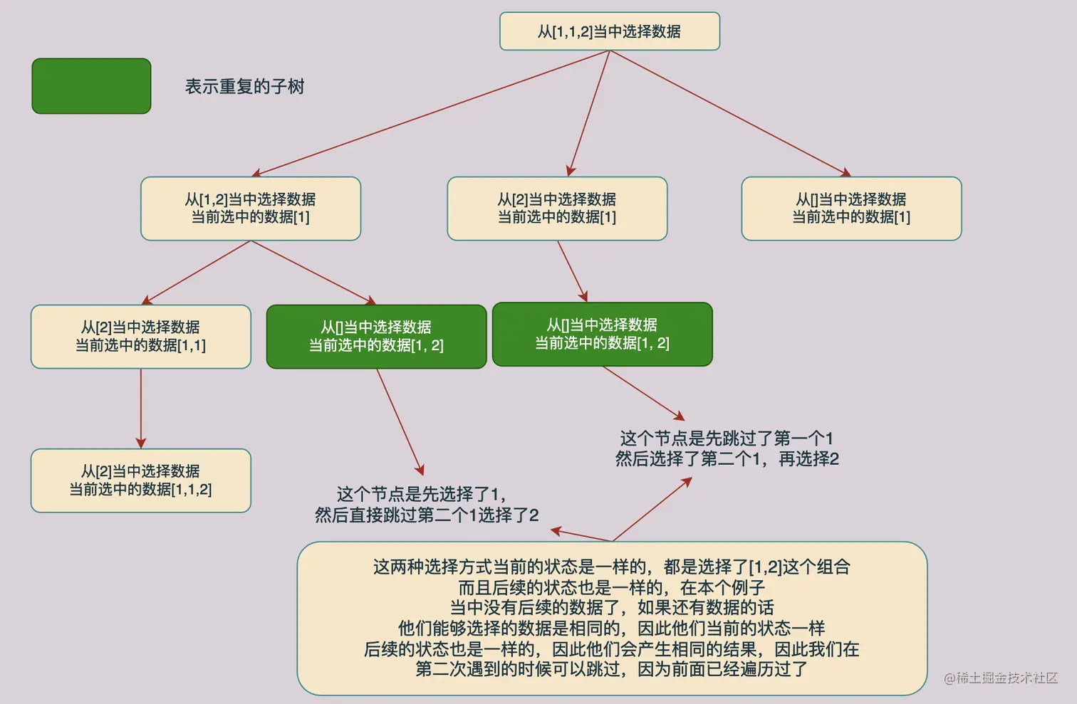 与前一种方法分析一样,当当前的数据和同一层上面的前一个数据相同的时候我们不需要进行求解了,可以直接返回跳过这个分支,因为这个分支已经在前面被求解过了。具体的分析过程如下图所示:
