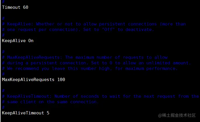 - KeepAliveTimeout 5 #设置来自同一个客户端一次连接多次请求之间的最大间隔时间,即两次请求之间超过该时间连接就会自动断开,从而避免客户端占用连接资源。