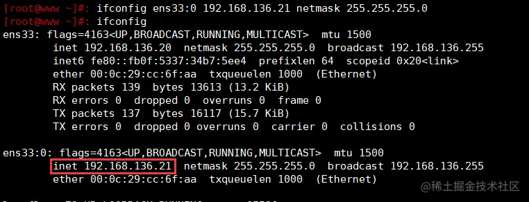 ifconfig ens33:0 192.168.136.21 netmask 255.255.255.0