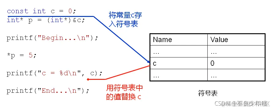 编译过程中若发现使用常量则直接以符号表中的值替换