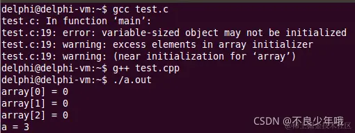 可以看到,该程序在C语言的编译环境下报错,这是因为在C语言中,const修饰的两个变量是只读变量,array[A + B]中的A+B只有在运行时才知道,所以会报错。而在C++的编译环境下,A和B是真正意义上的常量,所以编译器会到内部的符号表中取值,到array[A + B]时,编译器知道了A=1,B=2,当然不会报错了。