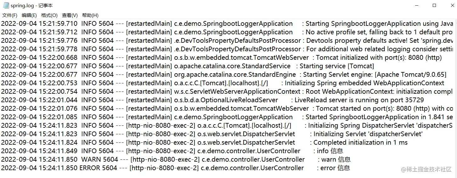 以上的日志都是输出在控制台上的,然而在生产环境上咱们需要将日志保存下来,以便出现问题之后追溯问题,把日志保存下来的过程就叫做持久化。