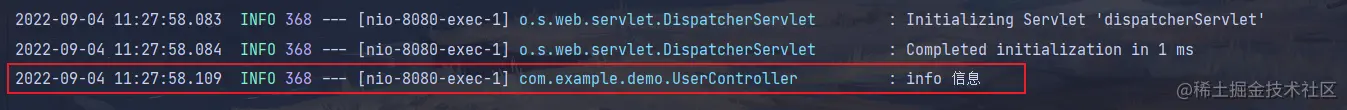 日志对象的打印方法有很多种,我们可以先使用 info() 方法来输出日志,如下代码所示: