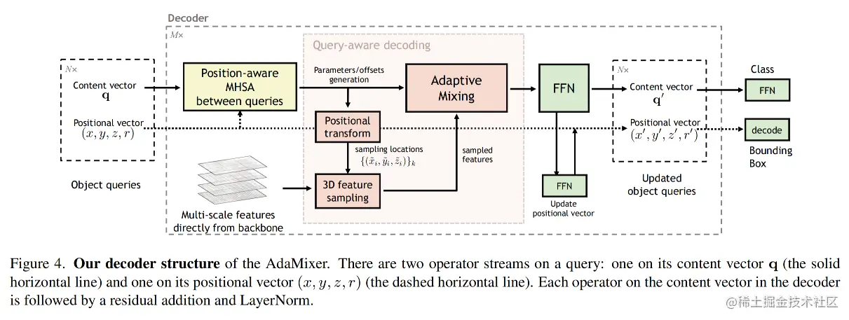 类似于《End-to-end object detection with transformers》和《Deformable DETR: deformable transformers for end-to-end object detection》中的解码器结构,作者将查询之间的自注意力机制、提出的自适应混合器和前馈网络 (FFN) 按顺序地放在一个解码器中关于查询内容向量 q 的阶段,如图4所示。