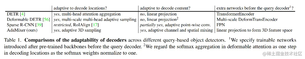 Plain attention decoders DETR 在查询和特征之间应用普通的多头交叉注意力机制,将目标查询转换到潜在的目标。如表1所示,交叉注意力解码器可以自适应于解码采样位置,因为它利用目标查询和特征的关系来聚合特征。然而,聚集后的特征线性变换不能根据查询自适应地对特征进行解码。