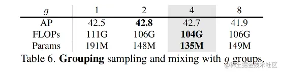 表6展示了不同 g 的分组机制的精度效果。