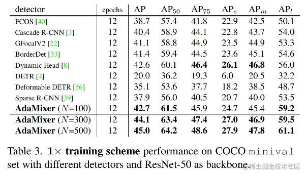1x 训练方案下,在 COCO minival 数据集上,不同检测器 与 backbone 为 ResNet-50 的 AdaMixer 相比较的表现,如表3所示。