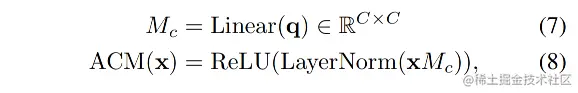 Adaptive channel mixing 自适应通道混合 (ACM) 是利用基于 q 的动态权重对通道维度上的特征 x 进行转换,以自适应增强通道语义,如公式 (7) 和 公式 (8)。