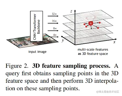 Adaptive 3D feature sampling process 查询首先生成 Pin 点的偏移向量的 Pin 集,其中每个偏移向量由 i 索引,并依赖于其内容向量 q 的一个线性层,如公式 (4)。
