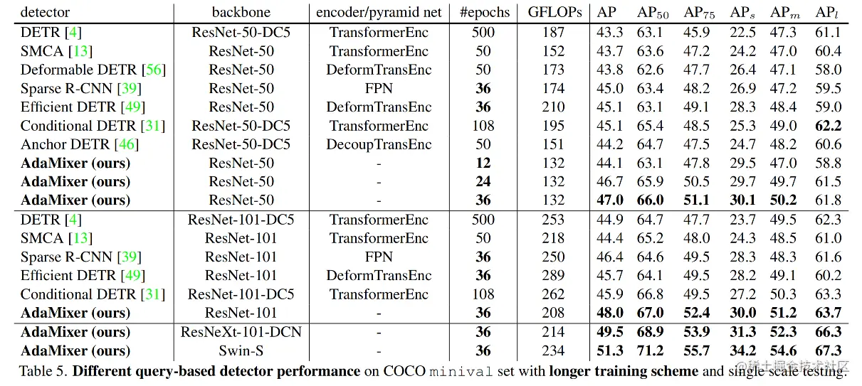 实验结果表明,在以随机翻转为唯一增强的标准 12 个 epochs 训练方案中 (1x 训练方案),以 ResNet-50 为 backbone 的 AdaMixer 在 100、300 和 500 次查询的设置下,在 MSCOCO 验证集上分别获得了 42.7、444.1 和 45.0 的 AP,在小目标检测方面获得了 24.7、27.0 和 27.9 的 APs。在和其他基于查询的检测器一样使用 3x 训练时间和更加强的数据增强的情况下,使用 backbone 为 ResNet-101、ResNeXt-101-DCN 和 Swin-S 的 AdaMixer 在单尺度和单模型测试中,分别获得了 48.0、49.5 和 51.3 的 AP,这显著超过了目前最先进的基于查询的检测器。