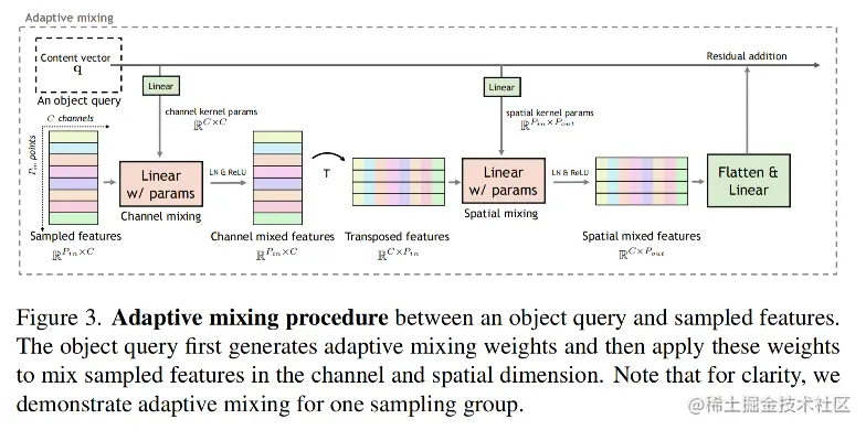 自适应混合过程总体如图3所示,其中自适应空间混合在自适应通道混合后,两种都应用到分组采样中。最后输出的形状跨组被展平,并通过线性层转换到 dq 维,并添加回内容向量。