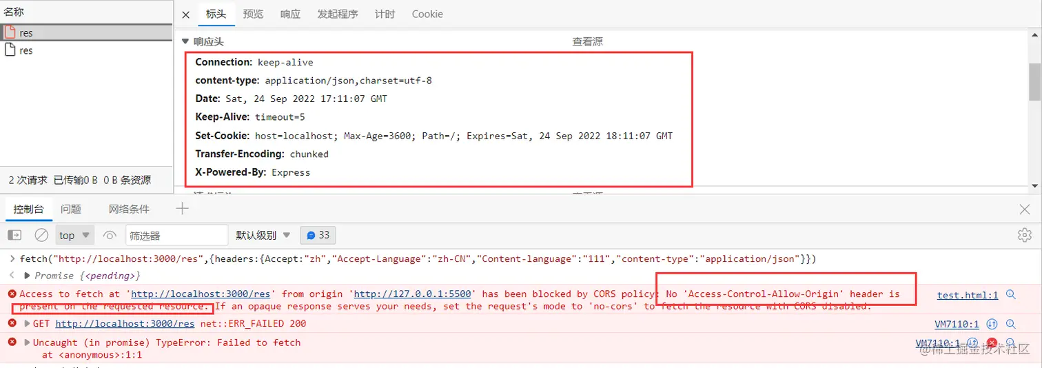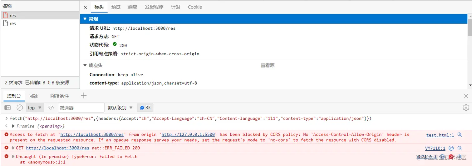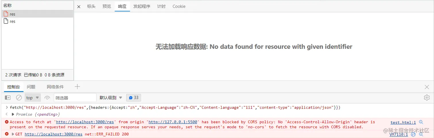 真正的请求,响应头无Access-Control-Allow-Origin字段,跨域不成功