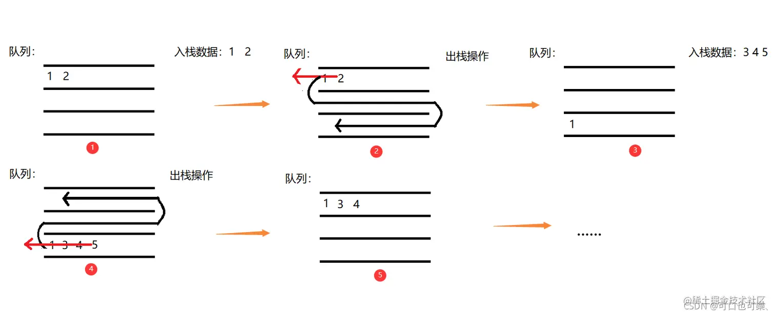 //出栈时,先将有数据的队列出队到最后一个元素,并将数据入队到空队列,最后将最后一个数据出队达到出栈的效果