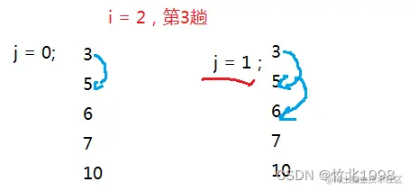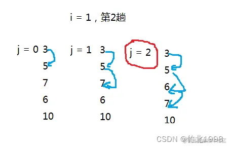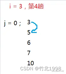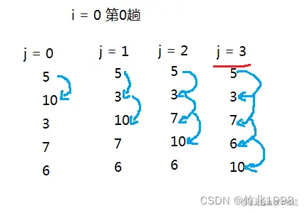 当j = 0时,此时数组是上一趟结束的数组{3,5,6,7,10},此时array[0] = 3; array[1] = 5;3 < 5,所以不执行array[j] = array[j+1]的交换代码,数组还是{3,5,6,7,10}。