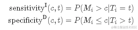 累积病例/动态ROC定义了在时间t 处的阈值c处的 灵敏度和特异性, 如下所示。