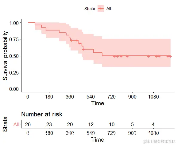 我们以数据 包中的dataset3survival为例。事件发生的时间就是死亡的时间。Kaplan-Meier图如下。