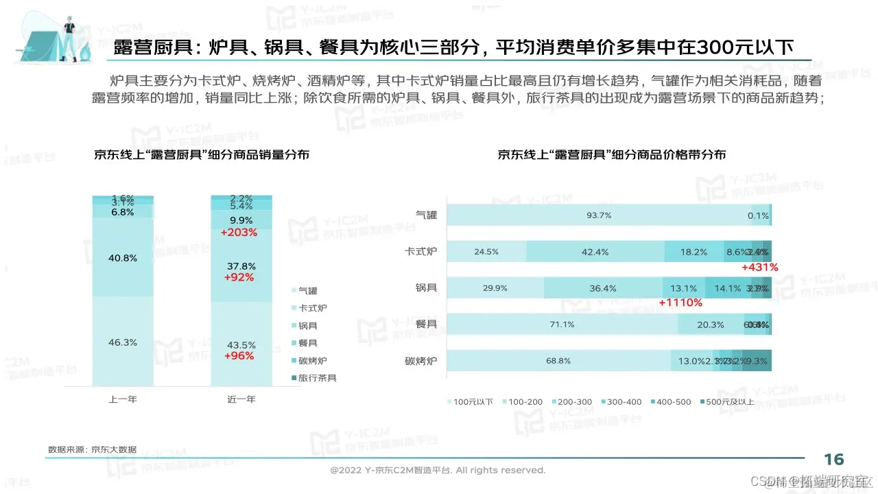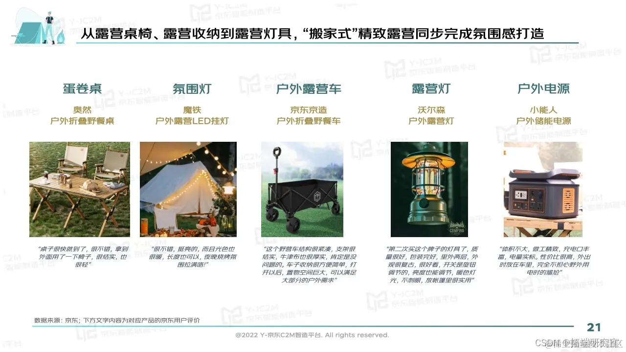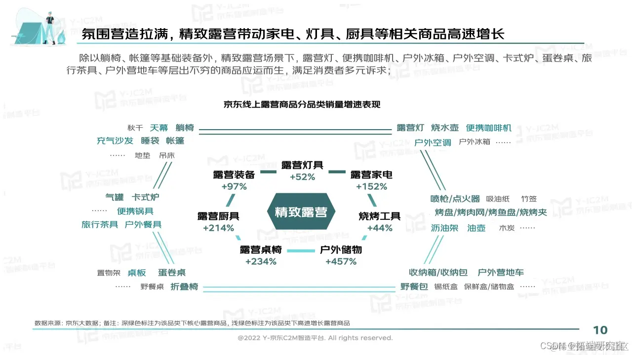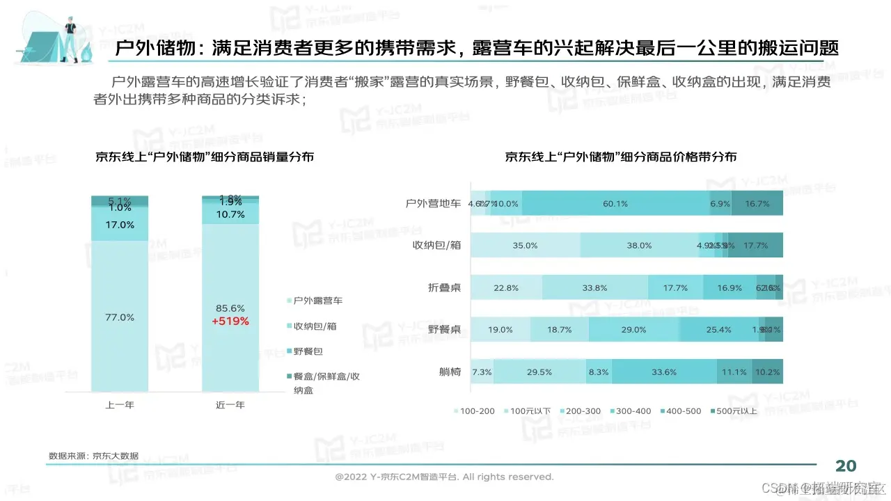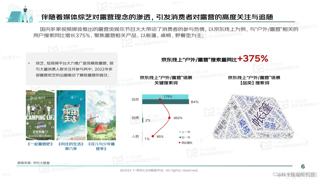国内多家视频媒体推出的露营类娱乐节目大大带动了消费者的参与热情,以京东线上为例,与“户外/露营”相关的用户搜索同比增长375%,聚焦露营相关产品,以帐篷、桌椅、野餐垫为主。