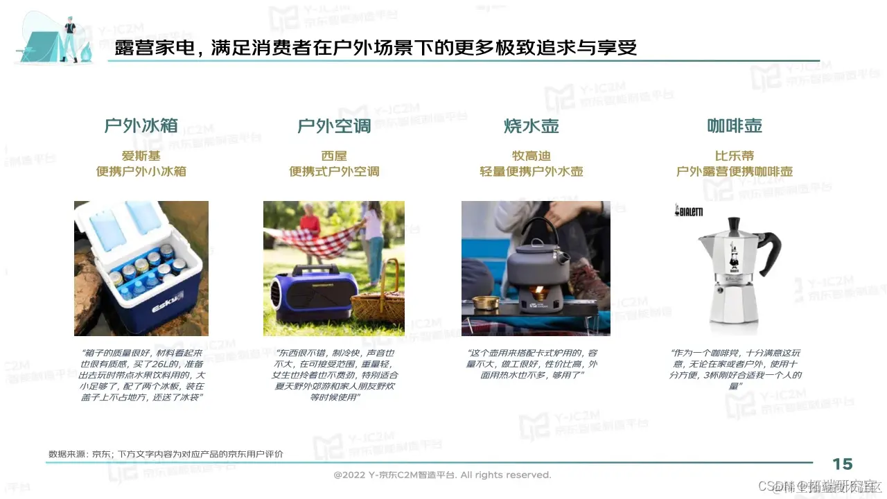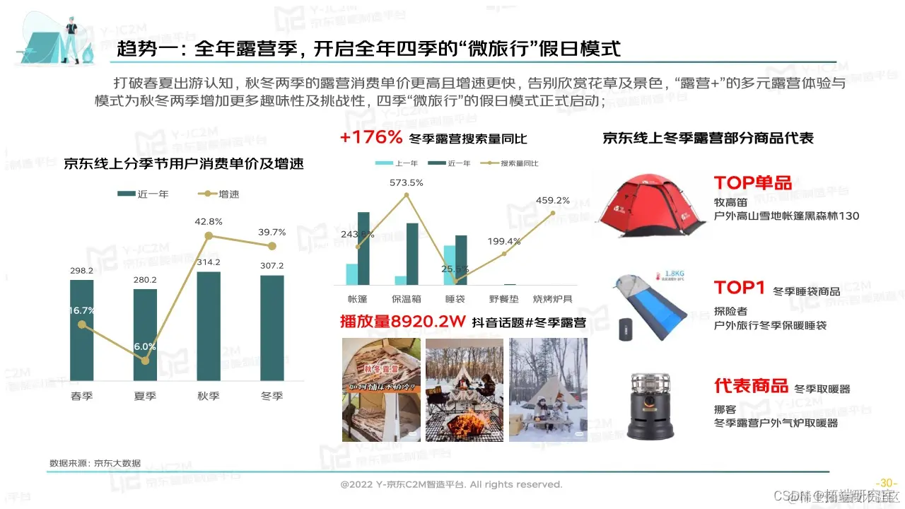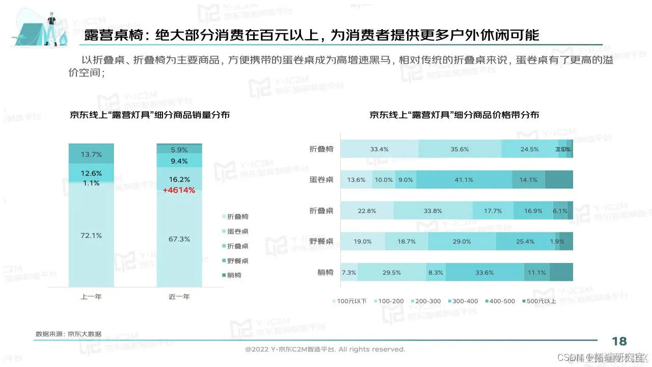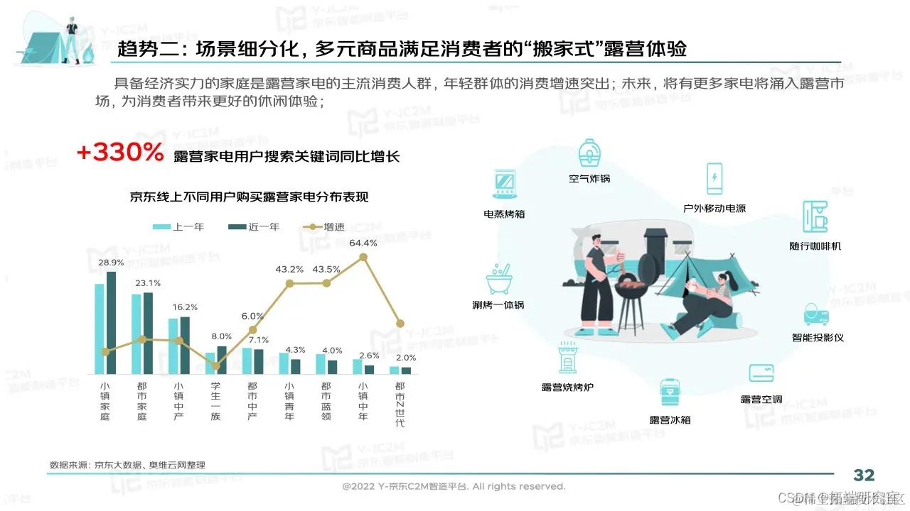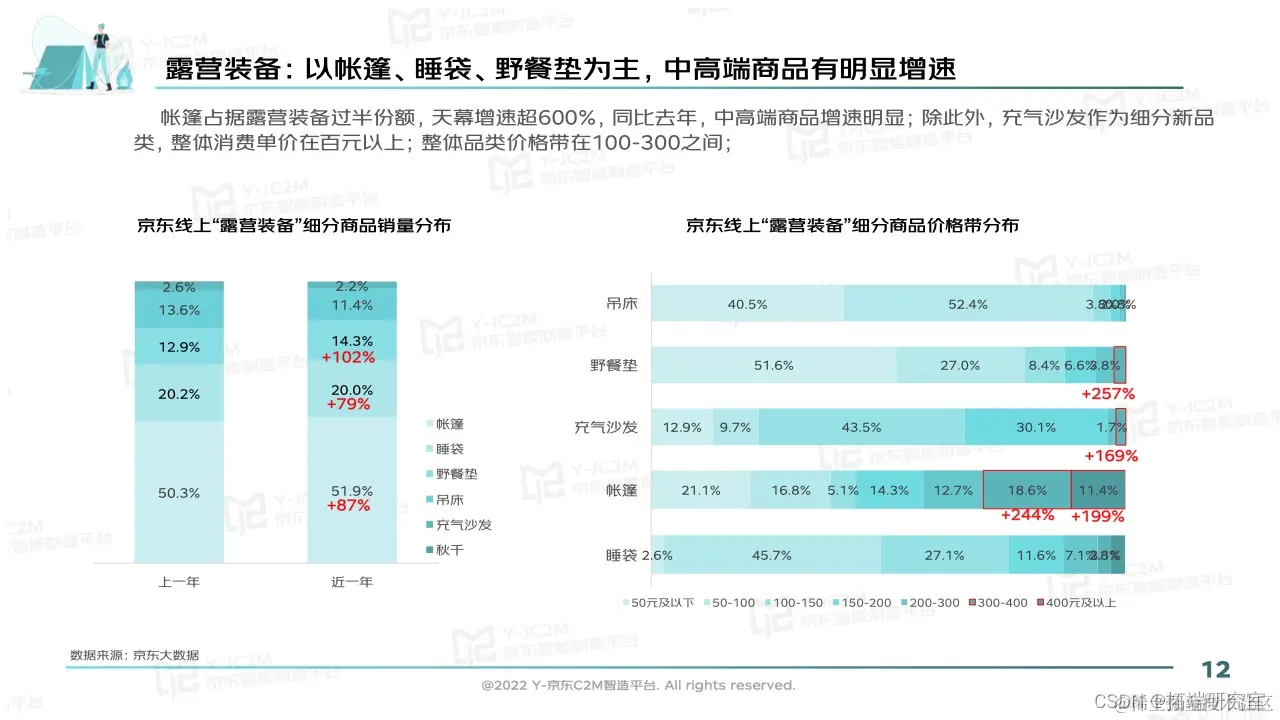 国内多家视频媒体推出的露营类娱乐节目大大带动了消费者的参与热情,以京东线上为例,与“户外/露营”相关的用户搜索同比增长375%,聚焦露营相关产品,以帐篷、桌椅、野餐垫为主。