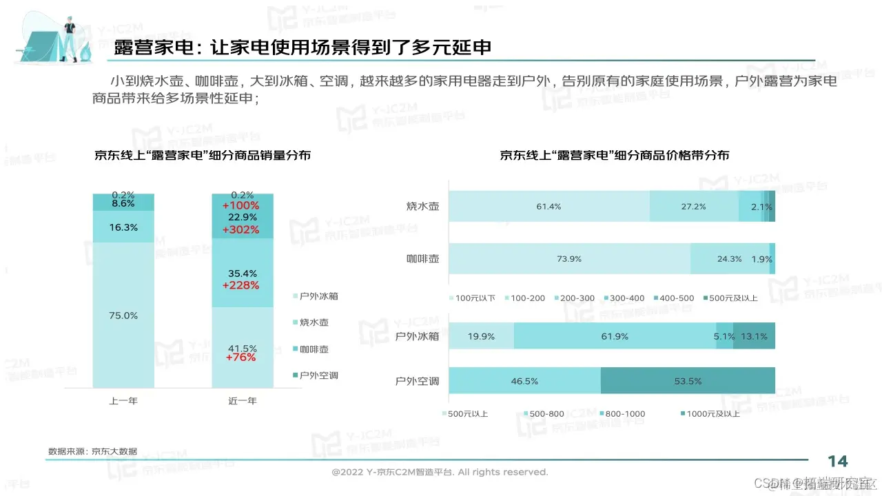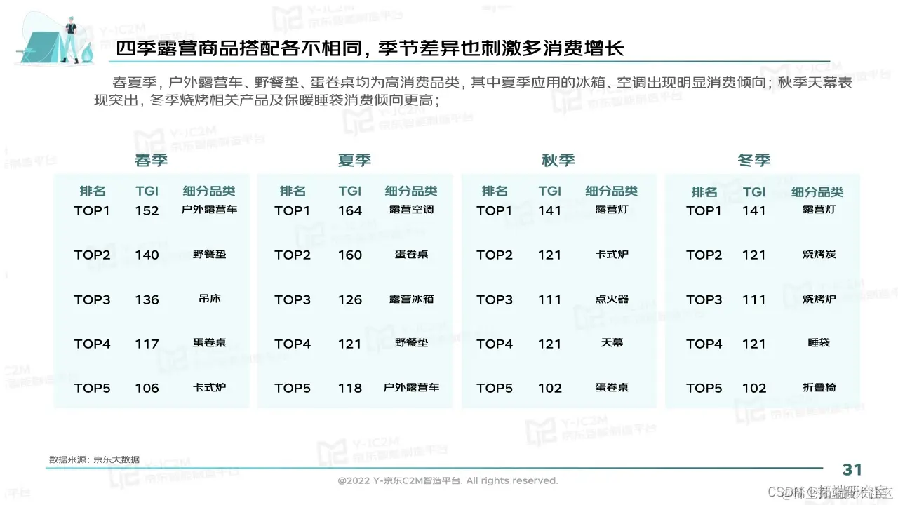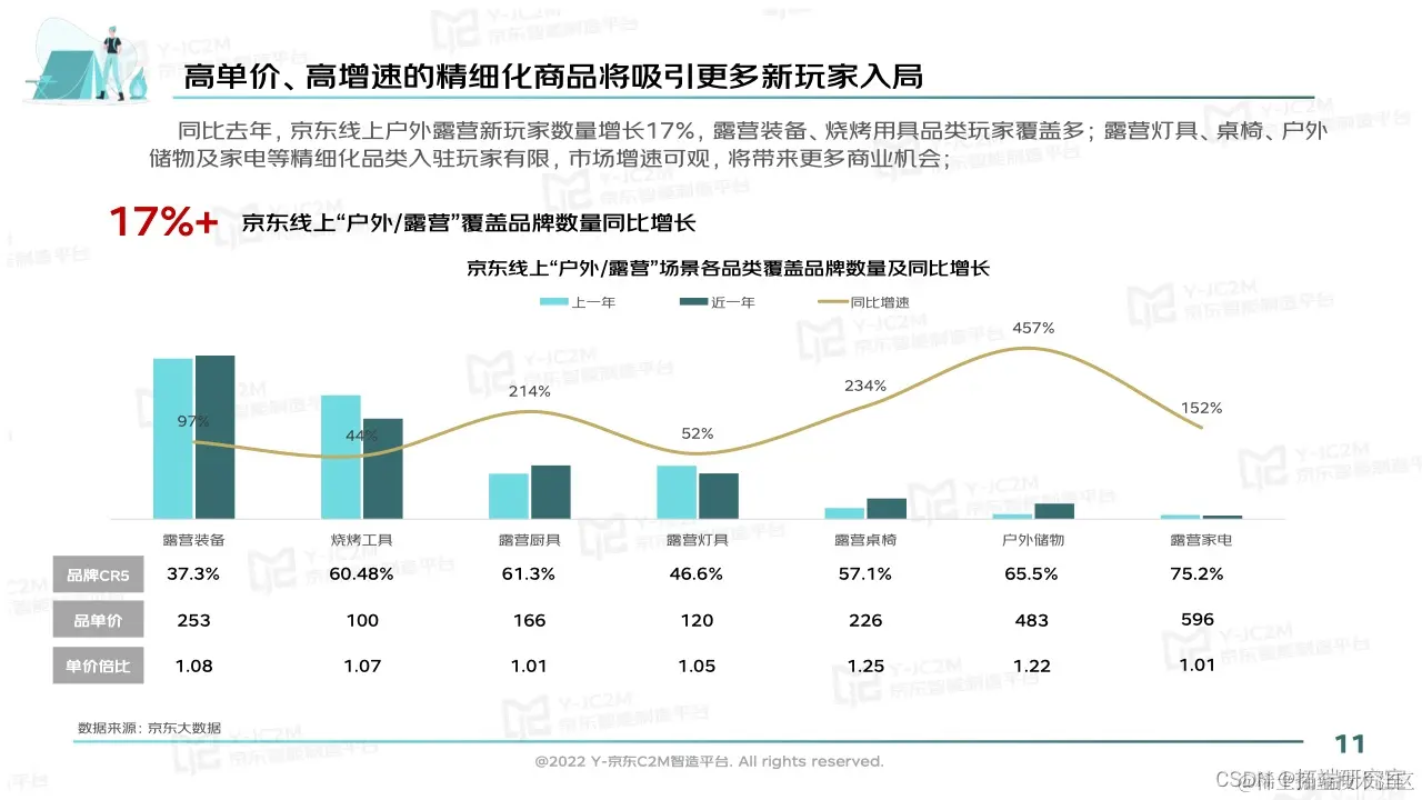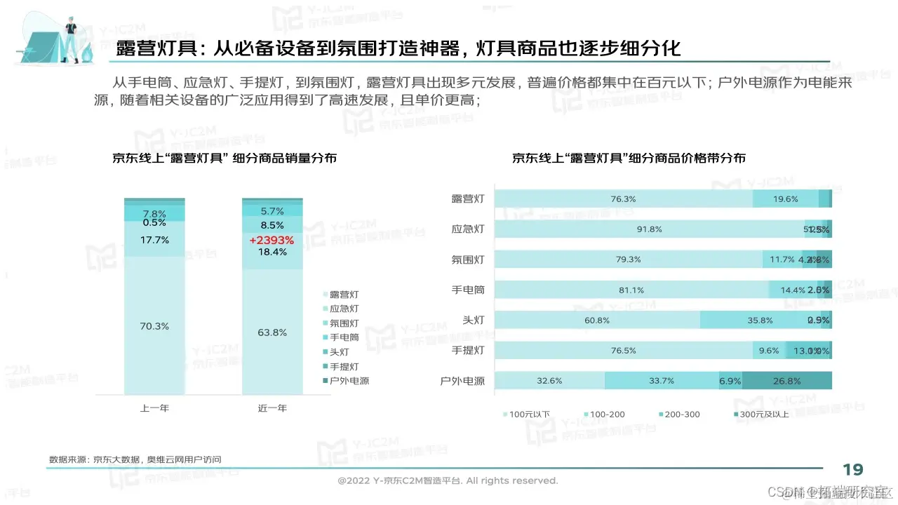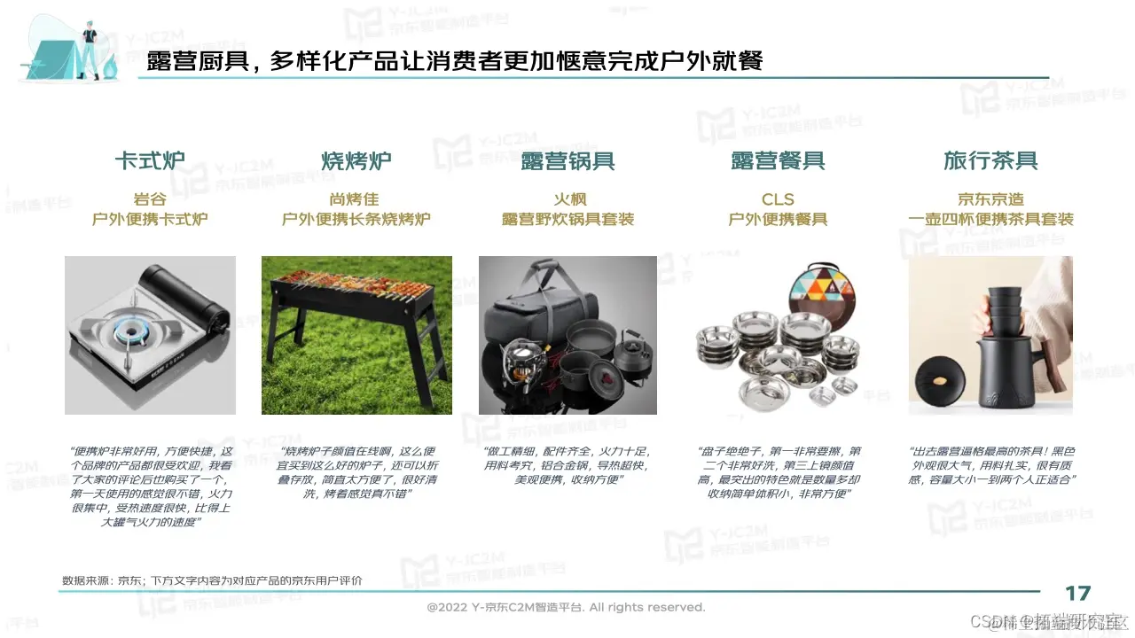 国内多家视频媒体推出的露营类娱乐节目大大带动了消费者的参与热情,以京东线上为例,与“户外/露营”相关的用户搜索同比增长375%,聚焦露营相关产品,以帐篷、桌椅、野餐垫为主。