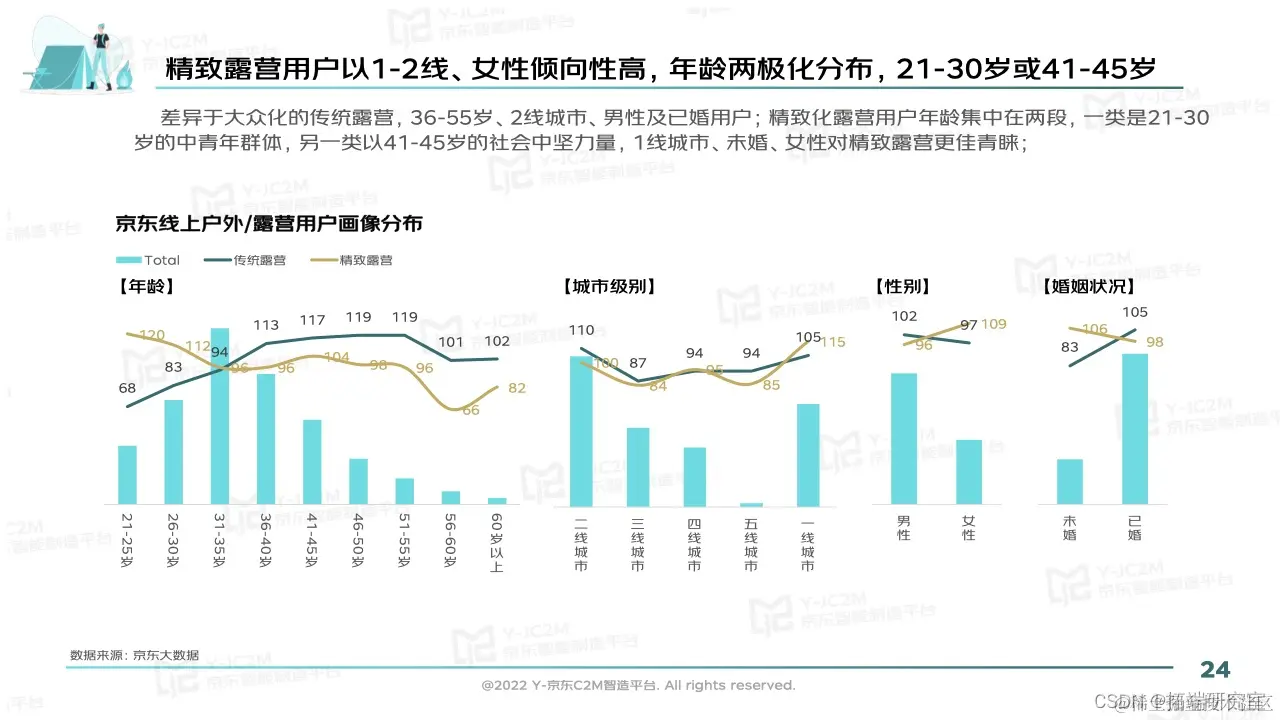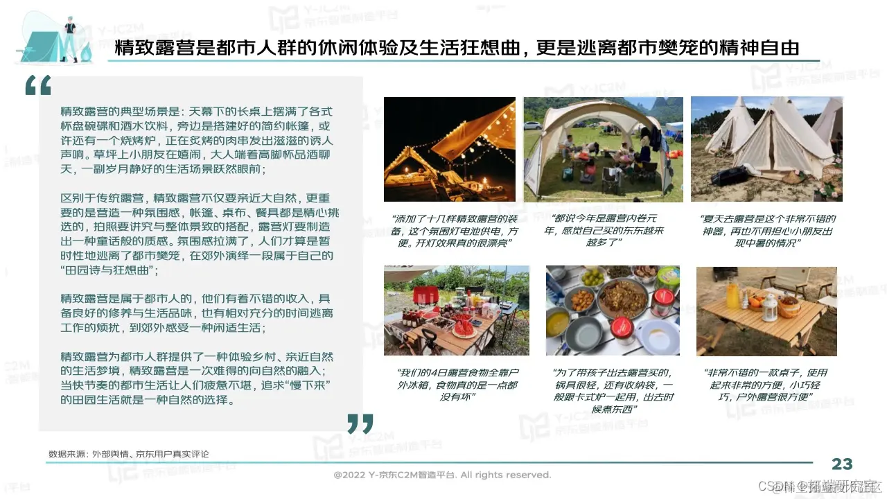露营分为三种模式,传统式露营、精致露营、BC露营,其中,精致露营的快速崛起,消费者从装备专业向舒适体验和氛围营造转型,使得露营过程更加注重情感消费。