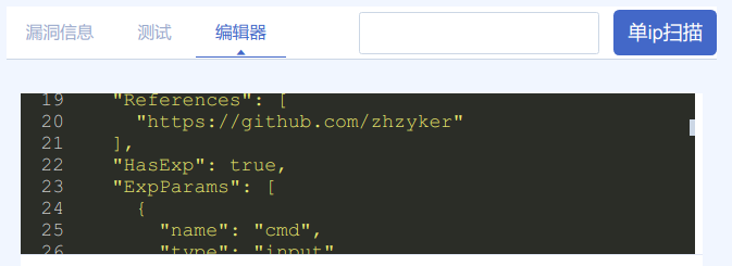 编辑器中可以看到你的PoC的json文件,默认的HasExp值为false,开启改true即可,ExpParams则是前端需要传递给 Exp 的参数,如要执行的命令。