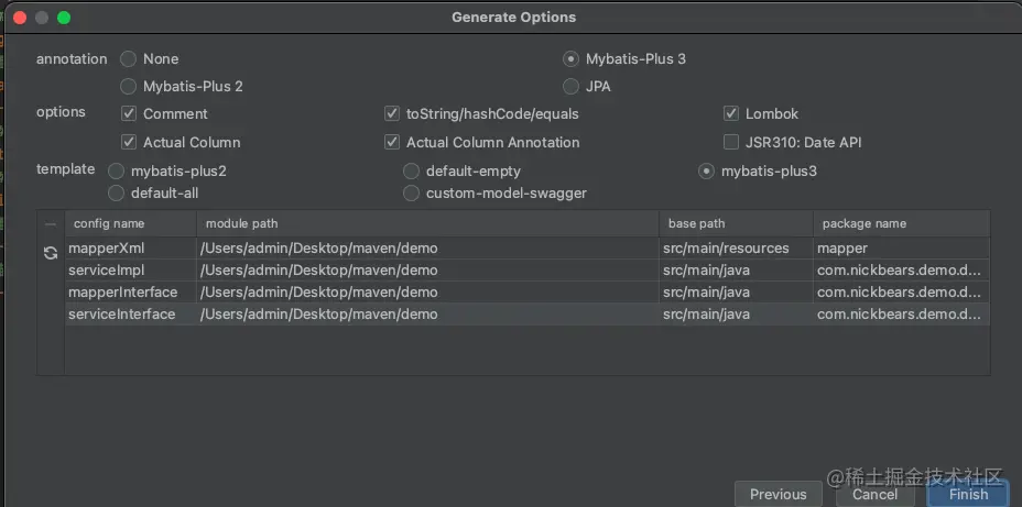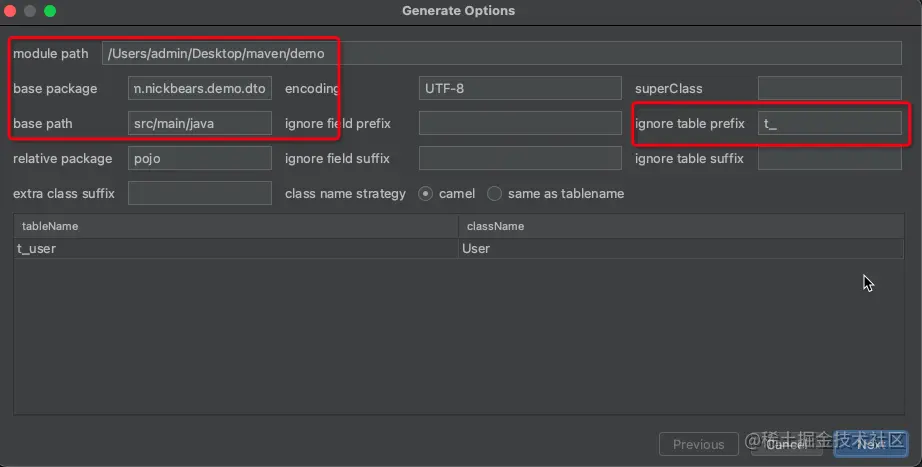 base package:生成的文件夹路径 (com.nickbears.demo.dto)