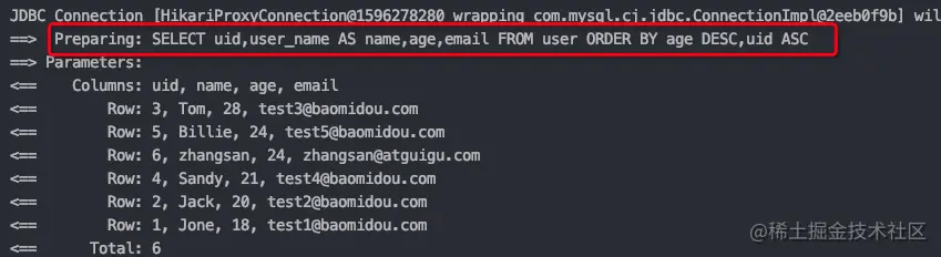 //查询用户信息,按照年龄的降序排序,若年龄相同,则按照id升序排序