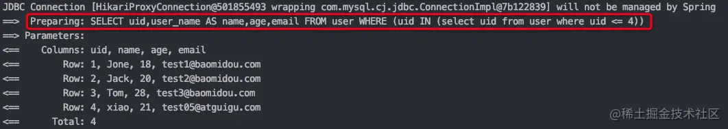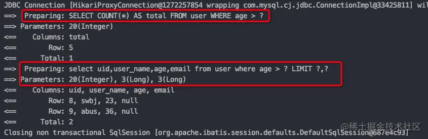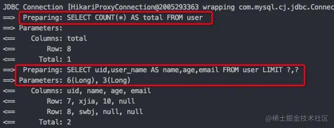 从运行的日志中可以看出,mybatis-plus的分页查询会先查出总条数,然后根据分页参数计算出当前页从第几个索引开始查。