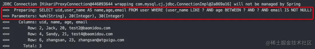 //查询用户名包含a,年龄在20到30之间,邮箱信息不为null的用户信息