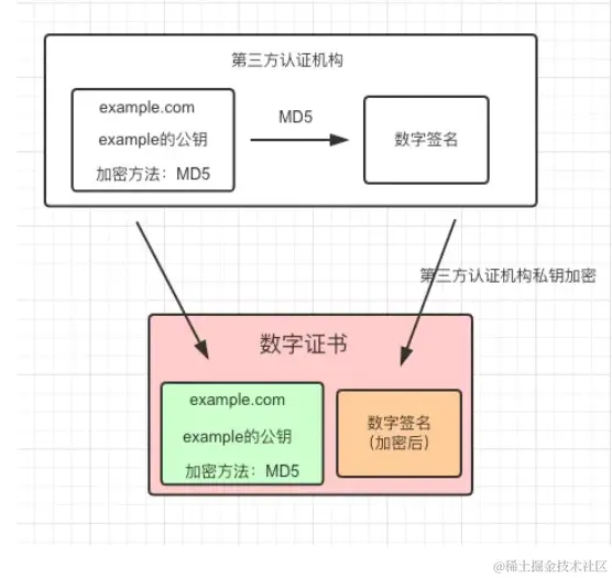 这里唯一不同的是,假设对网站信息加密的算法是MD5,通过MD5加密后,「然后通过第三方机构的私钥再次对其加密,生成数字签名」。
