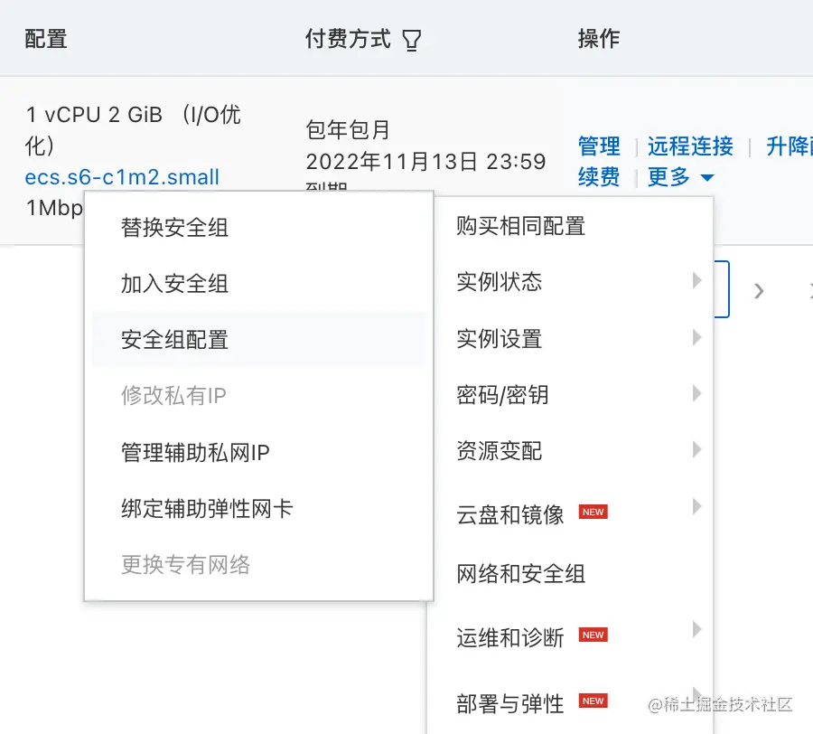 这种时候我们需要去云服务器控制台中选择服务器的实例界面进入安全组配置: