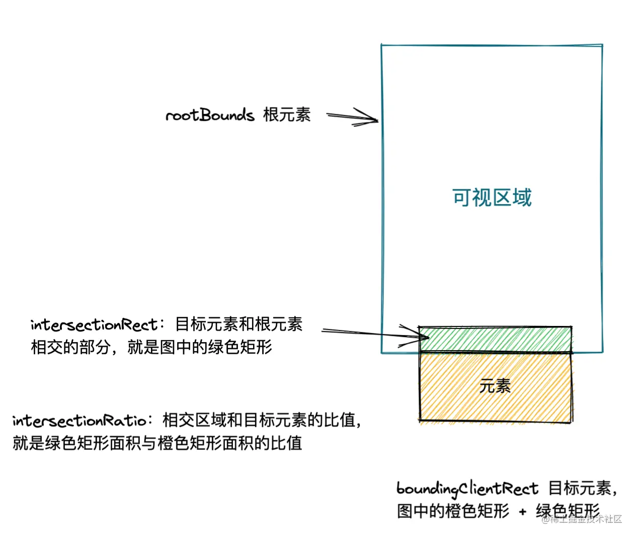 IntersectionObserver的时间到交叉被触发的时间的时间戳 - rootBounds:根元素的矩形区域的信息,