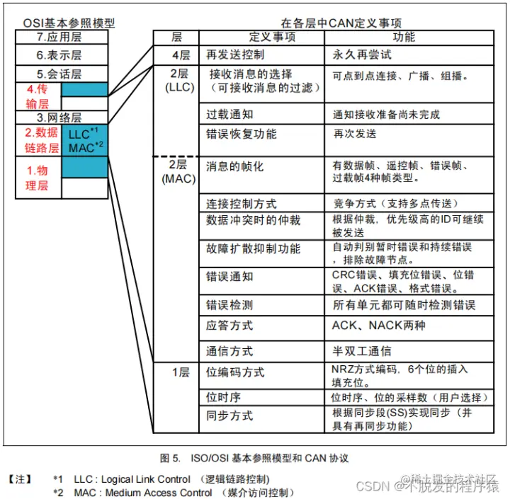 CAN 协议中关于 ISO/OSI 基本参照模型中的传输层、数据链路层及物理层,具体定义如下图所示。