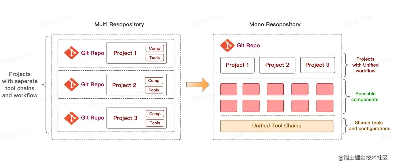 - 都在同一个仓库。如果是旧有项目,并且每个应用使用一个 Git 仓库的情况,那么使用 Monorepo 之后项目架构调整会比较大,也就是说改造成本会相对比较高