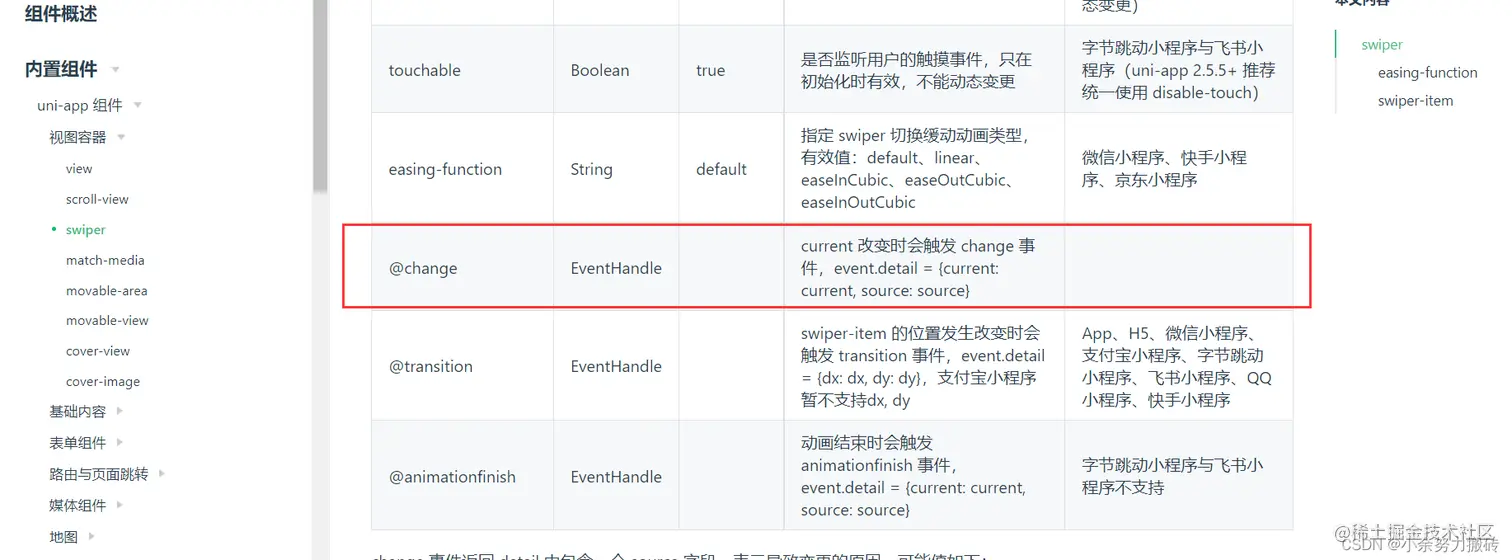 接下来在轮播图绑定@change事件,在方法中得到返回的current,不过我们需要调用tab栏自动滚动事件的scrollinto,从而实现,滚动tab栏也随之滚动,同样不了解tab栏如何自动跟随滚动的,需要去上一篇文章了解 (文章链接:t.csdn.cn/xcZDA****)