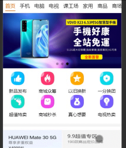 我们要讲整个轮播图要与可视高度一样,这里就需要在nLoad生命周期中获得系统高度,在减去tab栏和搜索框的高度就是可视高度,在动态绑定到轮播图上即可:style="'height:'+scrollH+'px'" scrollH是自己定义的